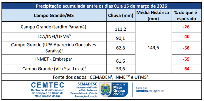 O maior registro de precipitação acumulada em Campo Grande, nos primeiros 15 dias de março de 2026, foi de 111,2 mm, observado no pluviômetro automático da UFMS — valor que representa 26% abaixo da média esperada para todo o mês de dezembro. A média histórica utilizada para comparação é baseada nos dados climatológicos da estação do INMET, localizada na EMBRAPA Gado de Corte, referentes ao período 1981–2010. Ao comparar os valores entre os diferentes pontos de medição oficiais do município, observa-se que as outras estações registraram precipitação acumulada (01 a 15 de março) abaixo da média histórica.