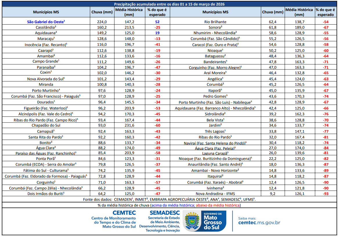 Na Tabela 1 são apresentados os valores de precipitação acumulada (mm), observados entre os dias 1 a 15 de março de 2026, nas estações meteorológicas do INMET e da SEMADESC, além dos pluviômetros automáticos do CEMADEN e da ANA. Ao comparar os acumulados observados nos primeiros 15 dias de março, com as médias históricas mensais, verifica-se que grande parte dos municípios monitorados registraram volumes de chuva abaixo da média histórica — lembrando que essa média refere-se ao mês completo. O município de São Gabriel do Oeste apresentou o maior acumulado no período, com 224,0 mm, valor que representa 52% acima do esperado para todo o mês.