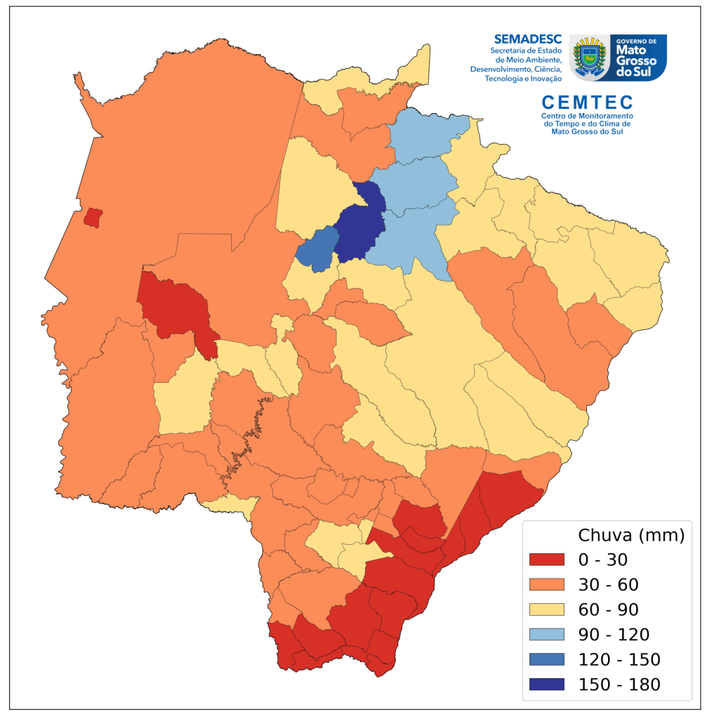 Pela análise da Figura 1, utilizando os dados do MERGE/INPE, observa-se que os maiores acumulados de chuva, entre 90 e 180 mm, ocorreram em municípios da região norte de Mato Grosso do Sul. Em contraste, as regiões Pantaneira e sudeste/leste registraram baixos volumes de precipitação, variando entre 0 e 30 mm, durante os primeiros 15 dias de março de 2026.